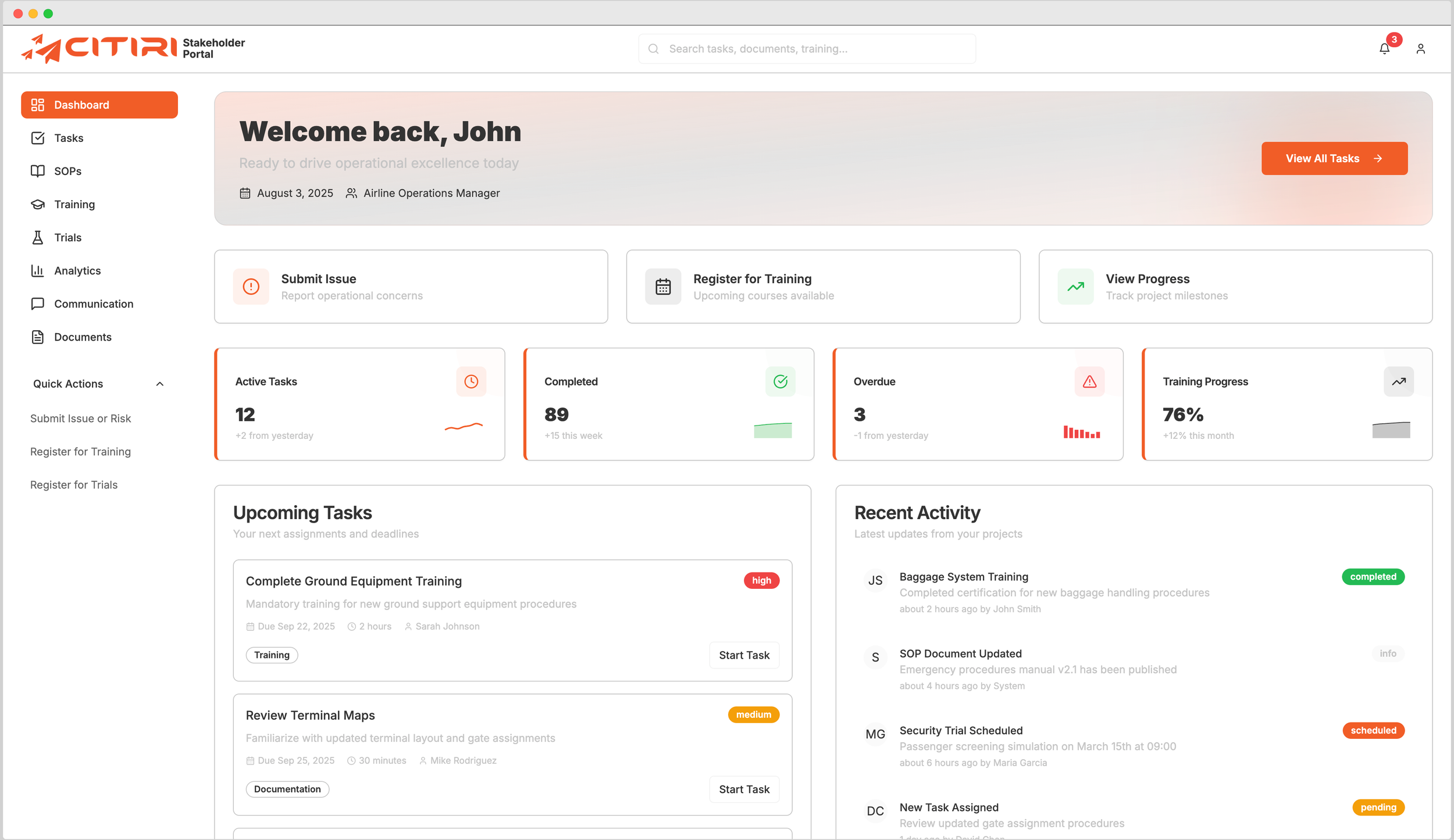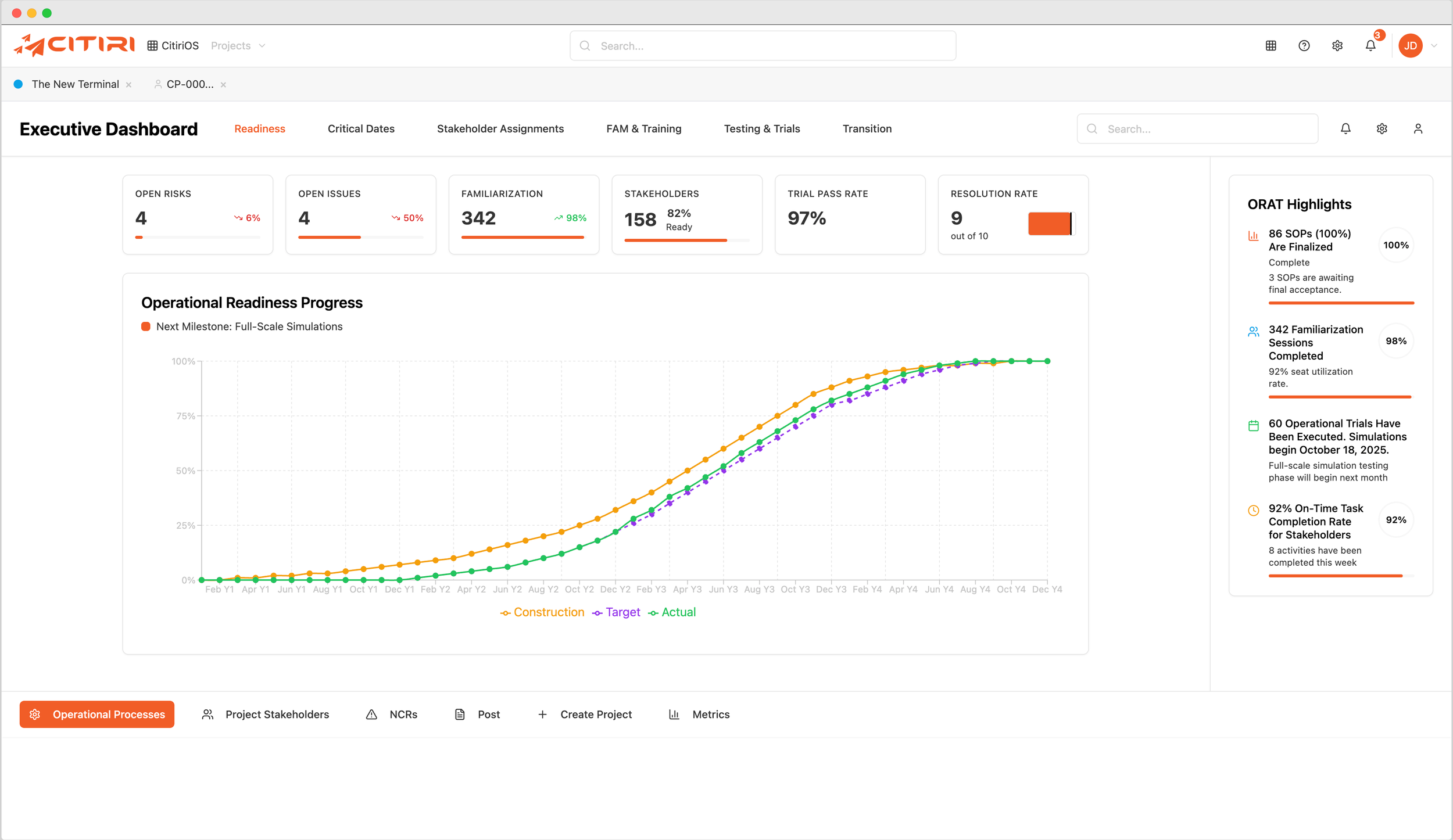 A purpose-built, integrated platform like CitiriOS is essential to maintaining ORAT alignment with construction progress and to simplify and accelerate orchestration of critical stakeholder deliverables, working groups, familiarization & training, system integration testing, trials, moves, and handover.