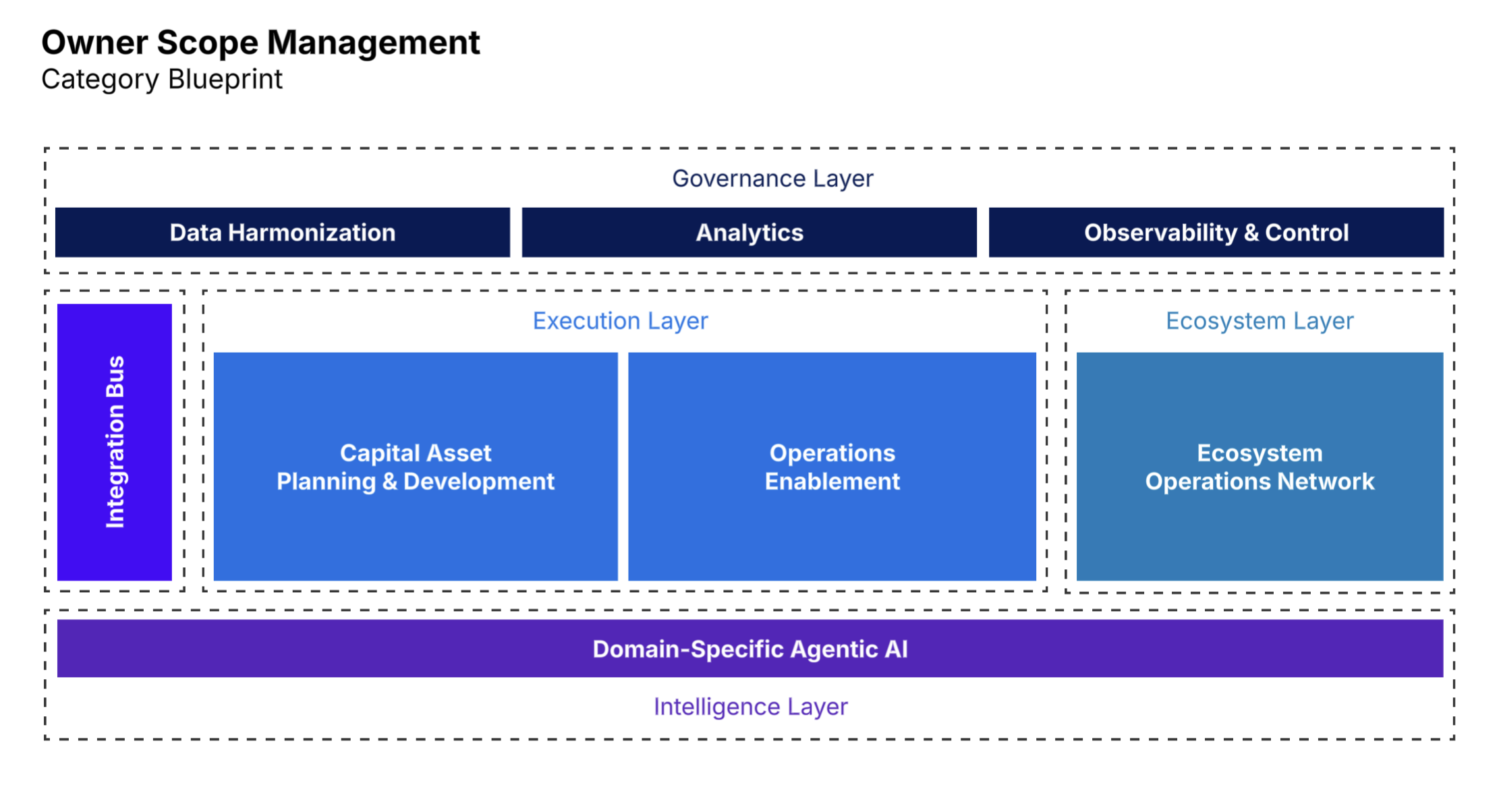The Owner Scope Management Category Blueprint: a Governance Layer (data harmonization, analytics, observability & control), an Execution Layer (capital asset planning & development, operations enablement, ecosystem operations network), an Integration Bus connecting to existing systems, and a Domain-Specific Agentic AI Intelligence Layer across the entire stack.